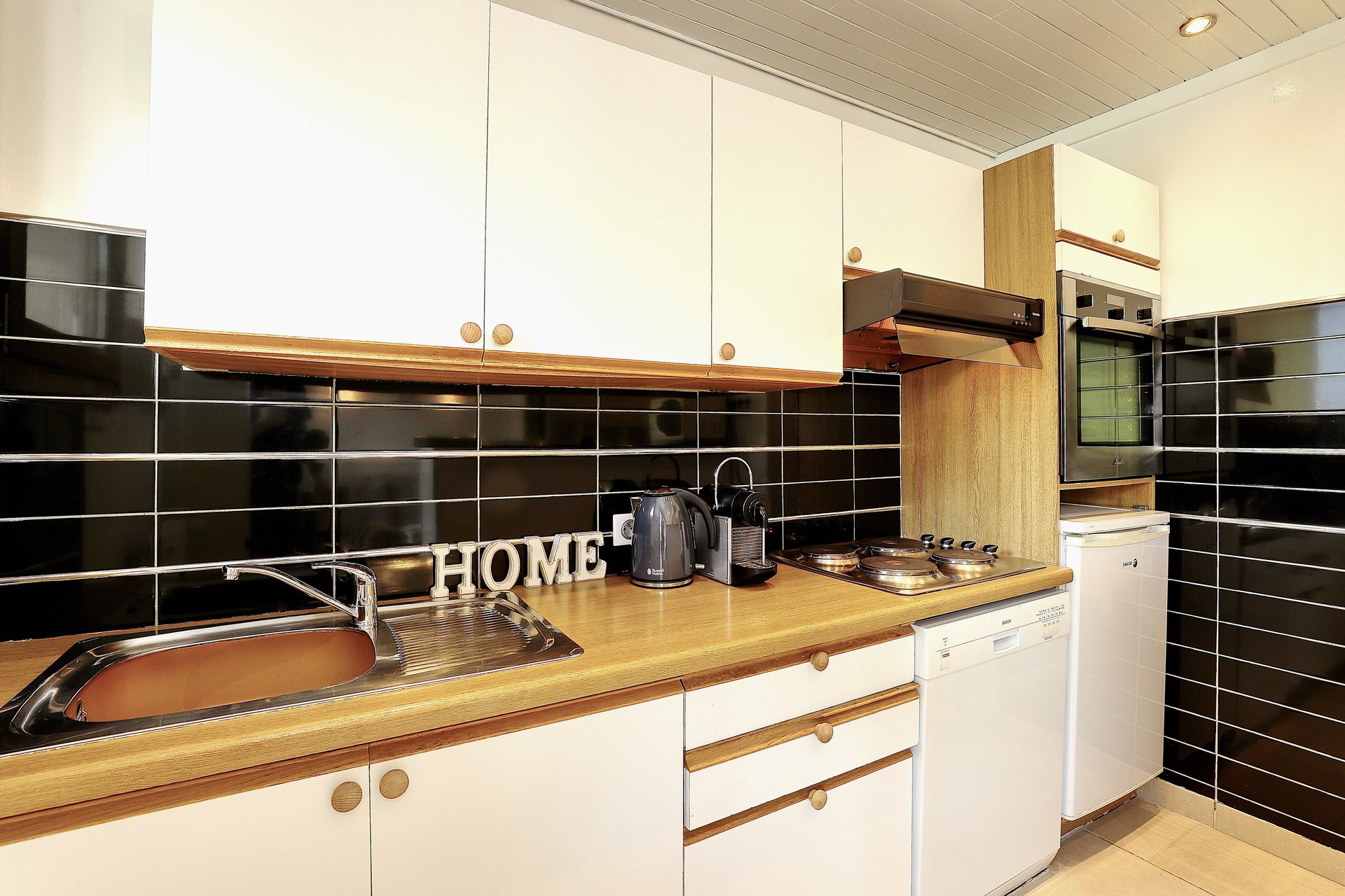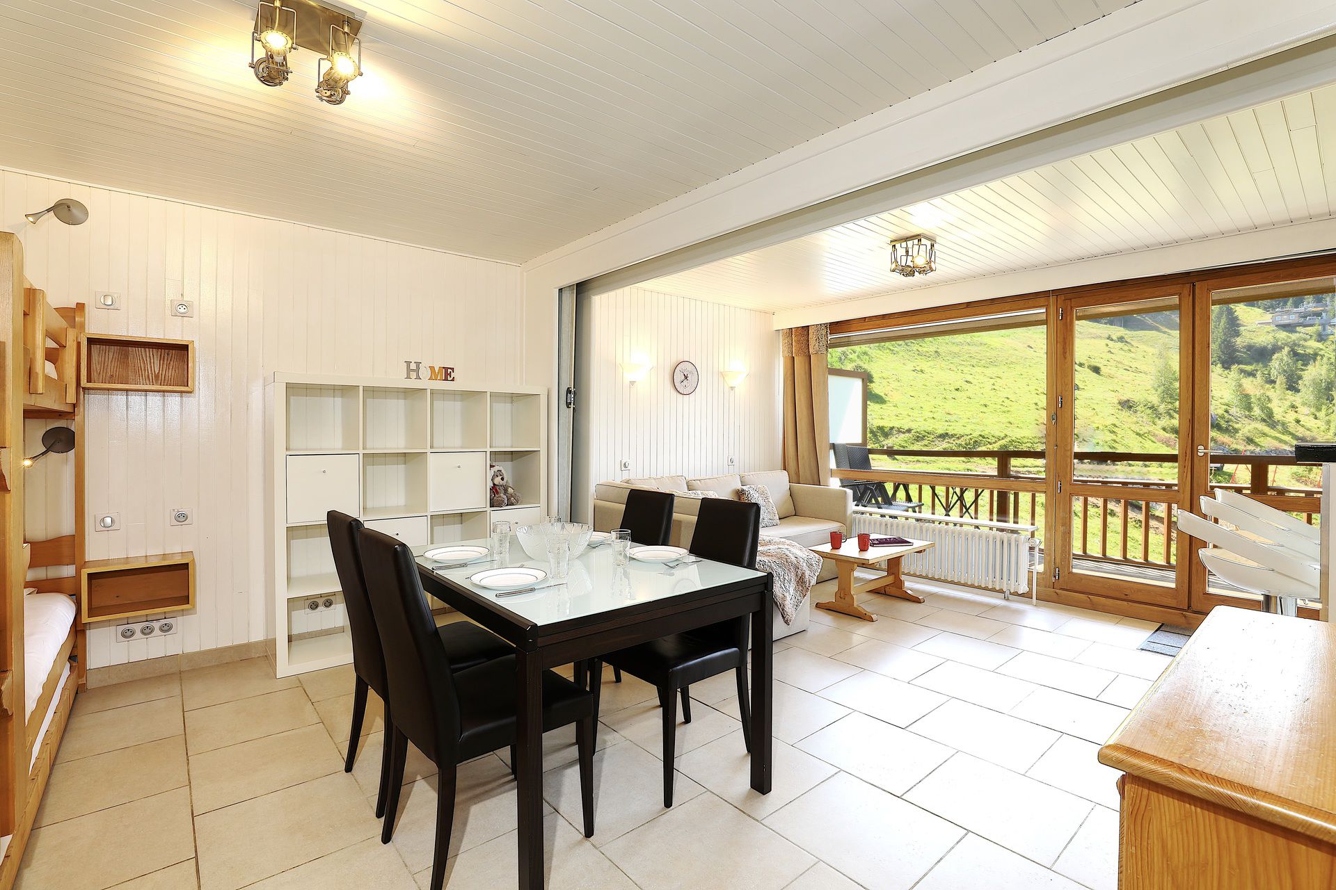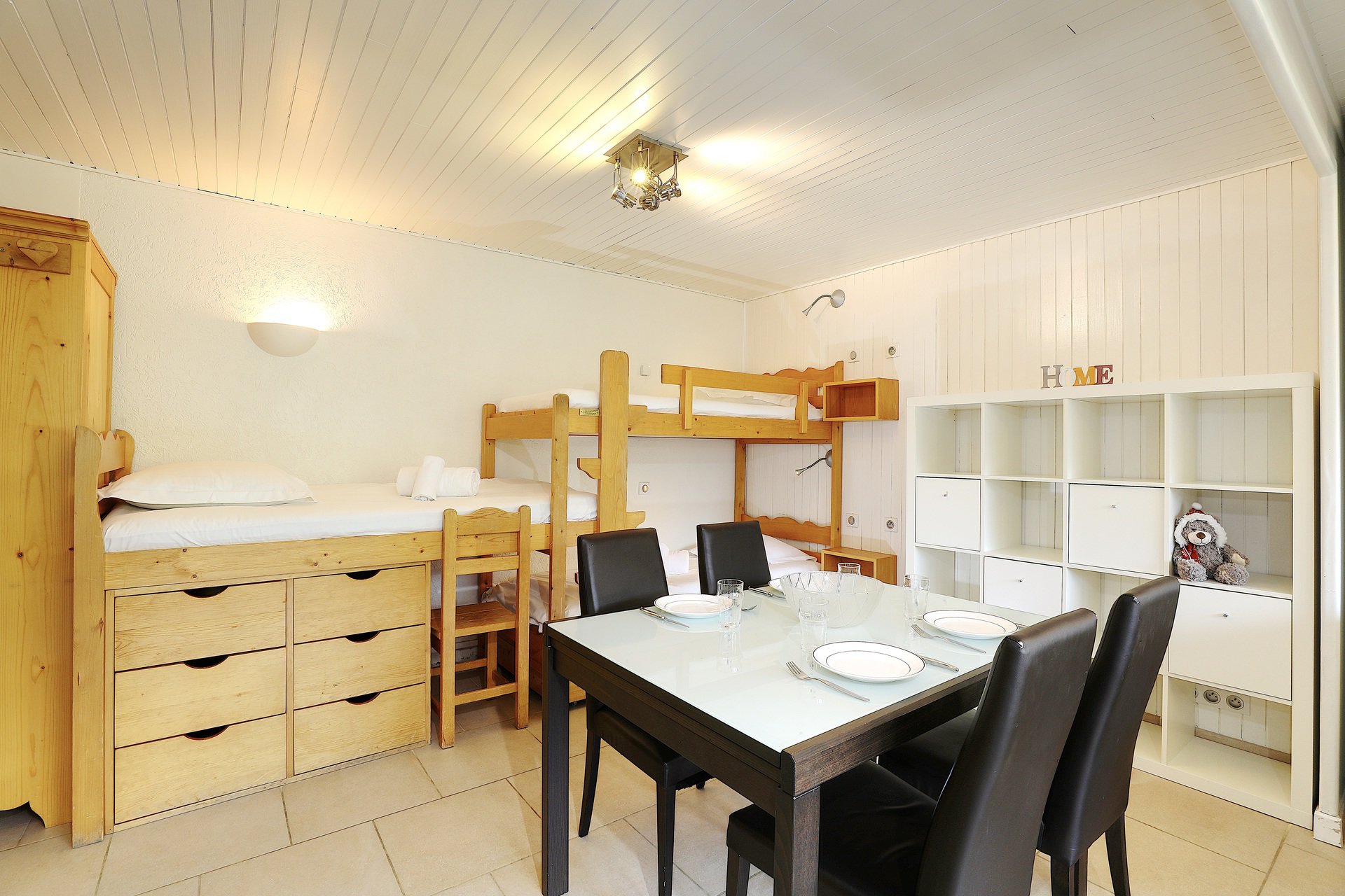 Composed by a living room with sofa bed (160 x190) and bunk beds, television, and dining area. The fully-equipped open-plan kitchen (oven, microwave, hob, dishwasher, etc.) is separate from the living area.