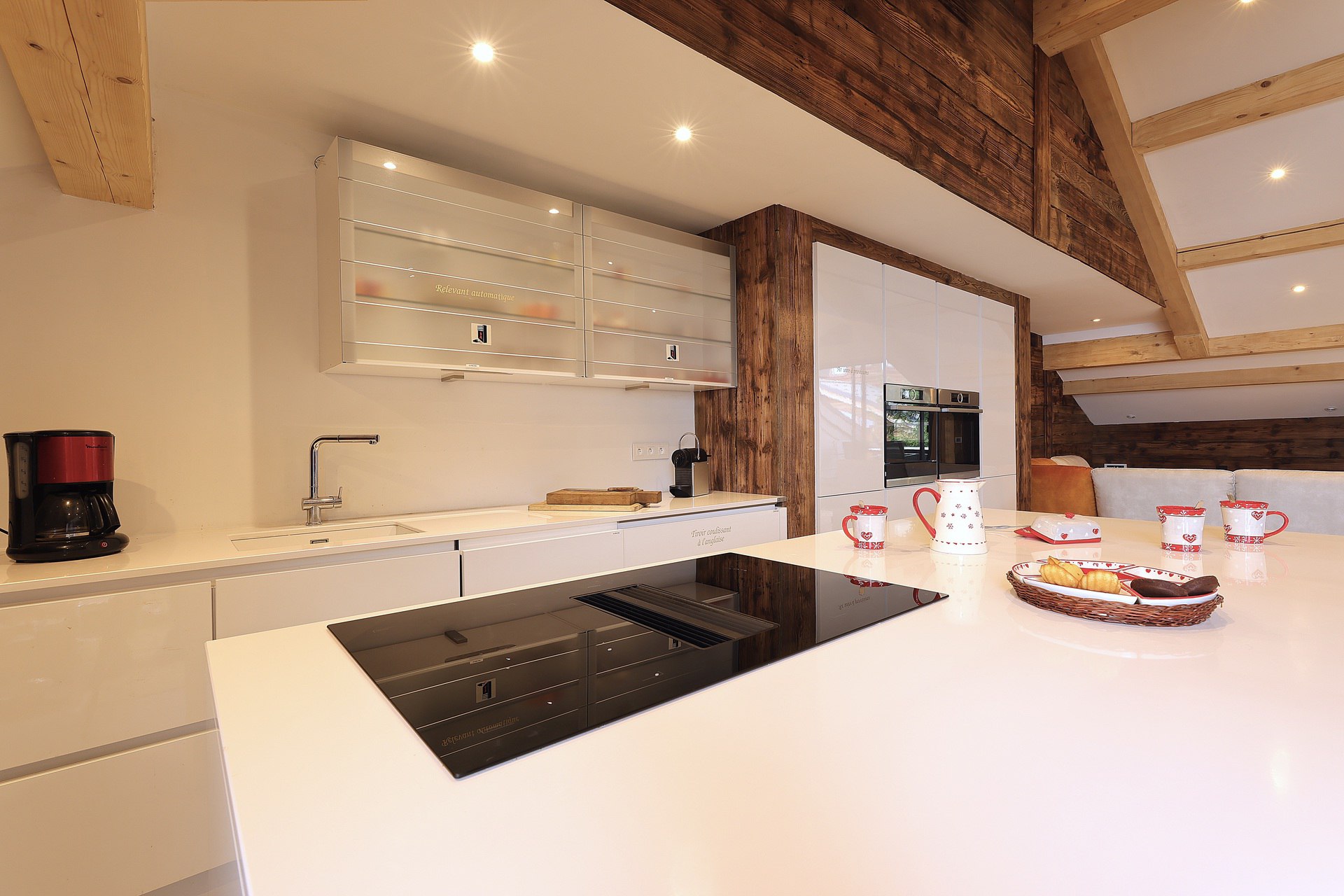 Cuisine ouverte : entièrement équipée pour répondre à vos exigences (réfrigérateur, freezer, four, micro-ondes, lave-vaisselle, cafetière a filtre, cafetière nesporesso...).