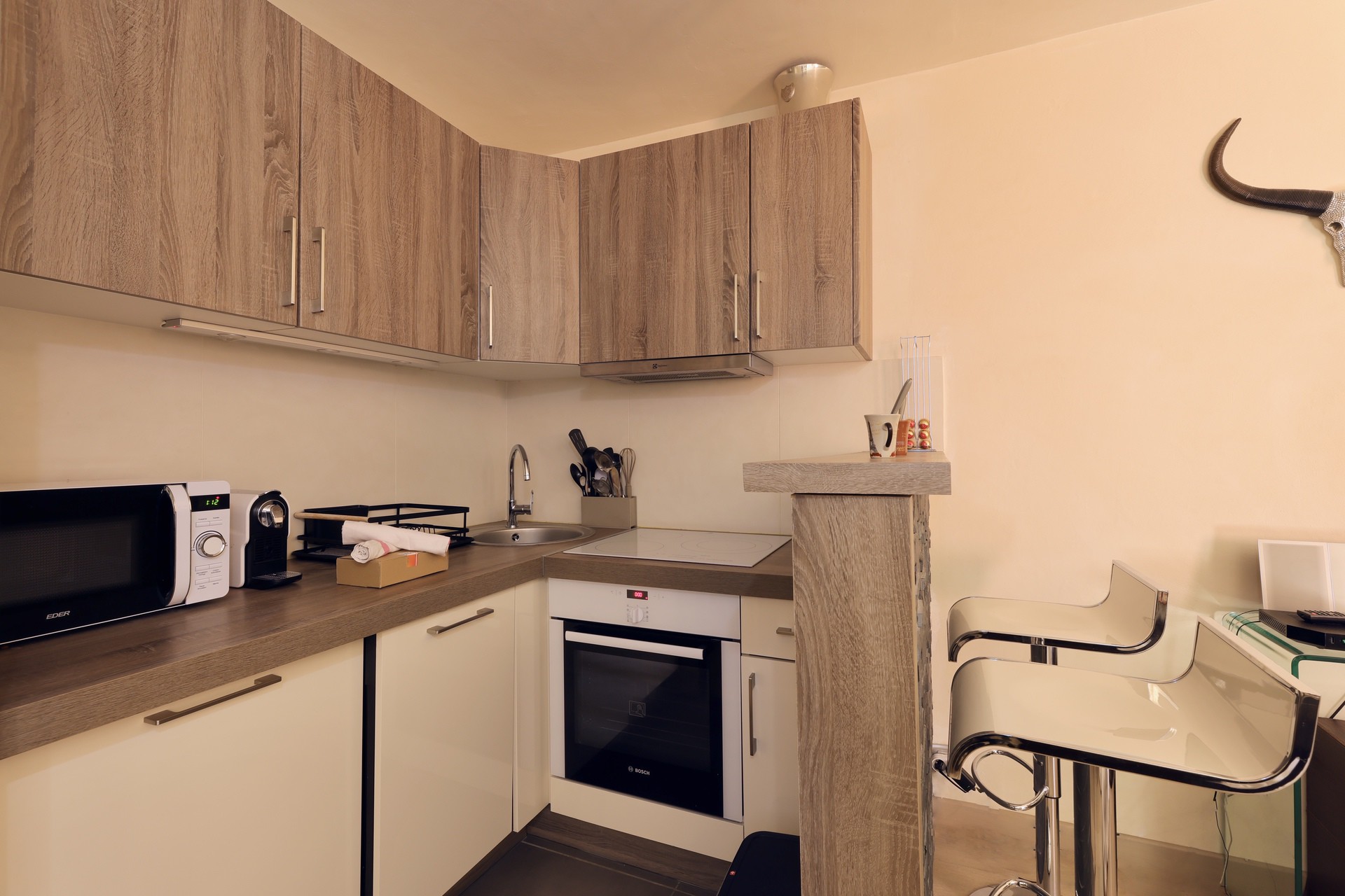 La cuisine moderne et entièrement équipée (four, plaques de cuisson, micro-ondes, réfrigérateur, bouilloire) offre tout le nécessaire pour préparer vos repas en toute simplicité.